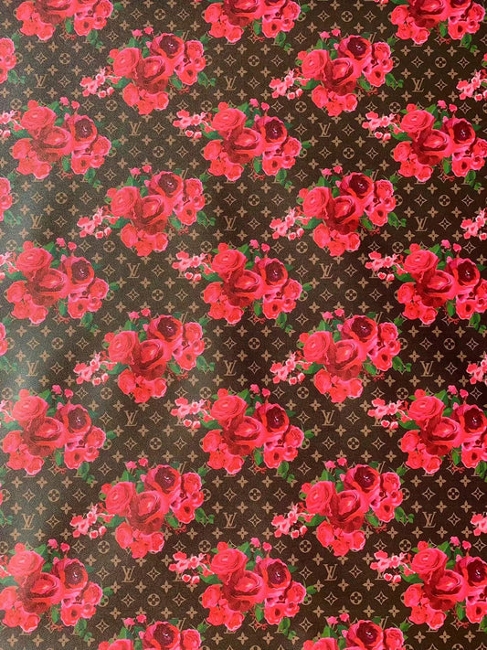 Brown Background LV With Red Rose Design Leather Fabric For Handmade Bags,Sneaker,Furniture Goods