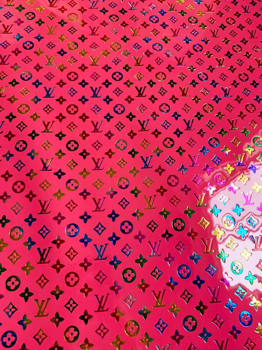 Craft Deep Pink Mirror Reflection Colorful LV Embossed Leather For Handmade Sneaker, Upholstery Goods