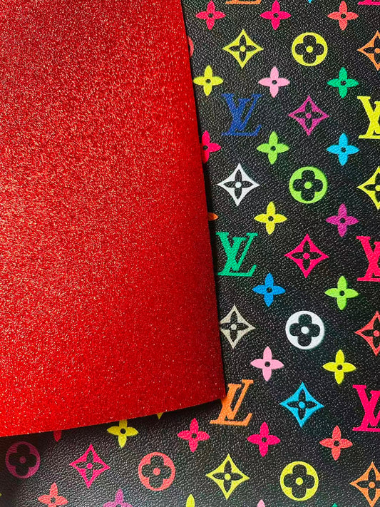 Fashion Black Colorful LV Red Glitter Background Leather For DIY Handicraft Goods